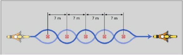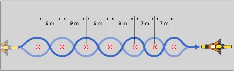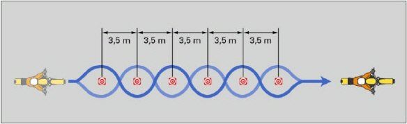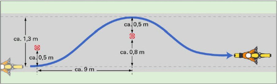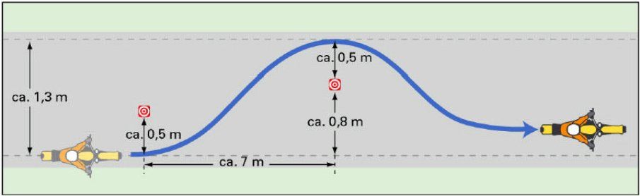 The applicant has to drive a slalom course (length approx. 50 m, 5 traffic cones, distance 7 m, construction see sketch to 5) at a speed of approx. 30 km/h.