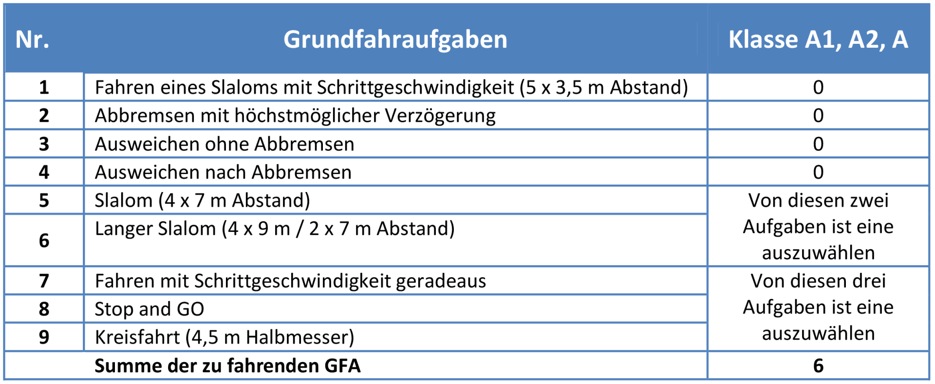 Above you see a table with the basic driving tasks that have to be completed in each test. The officially recognized expert chooses a task from 5/6 and from 7, 8 and 9 that should be checked.