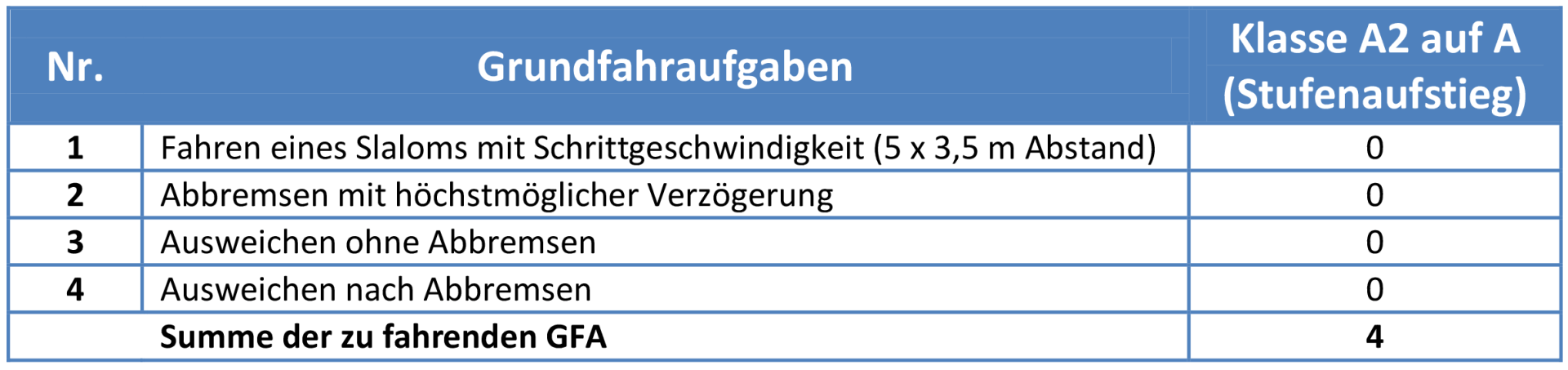 Above you can see a table with the basic driving tasks that have to be completed in each test.