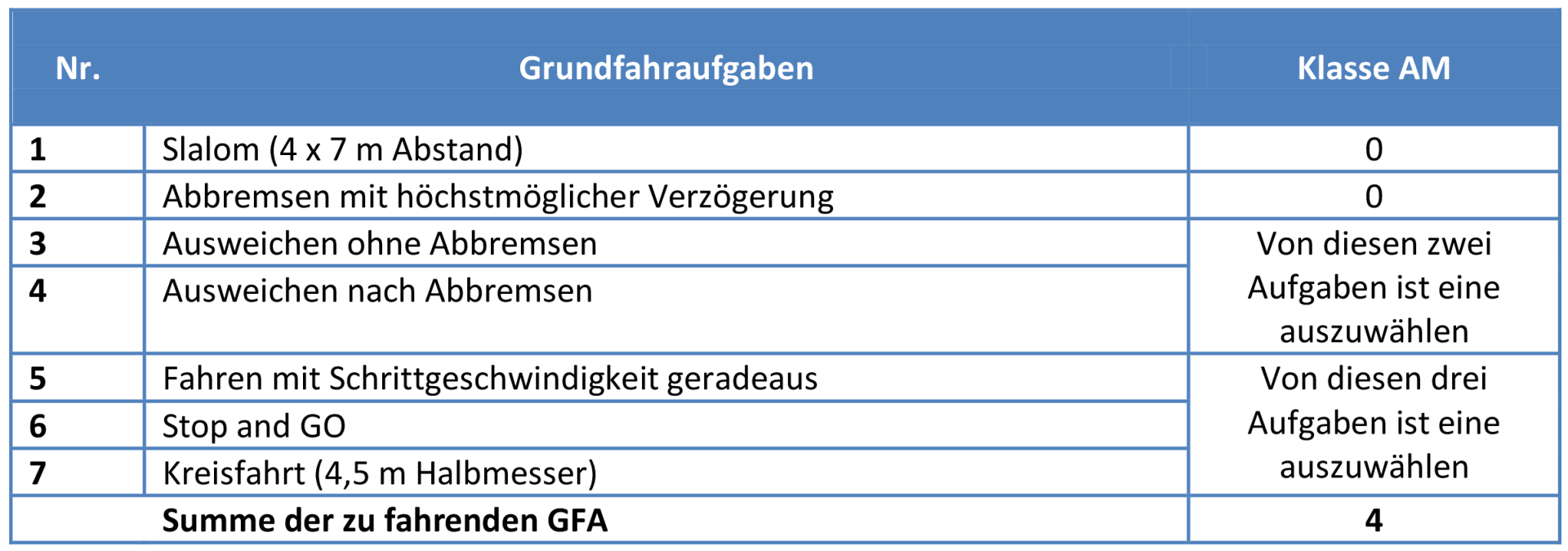 Above you see a table with the basic driving tasks that have to be completed in each test. The officially recognized expert chooses a task from 3/4 and from 5, 6 and 7 that should be checked.